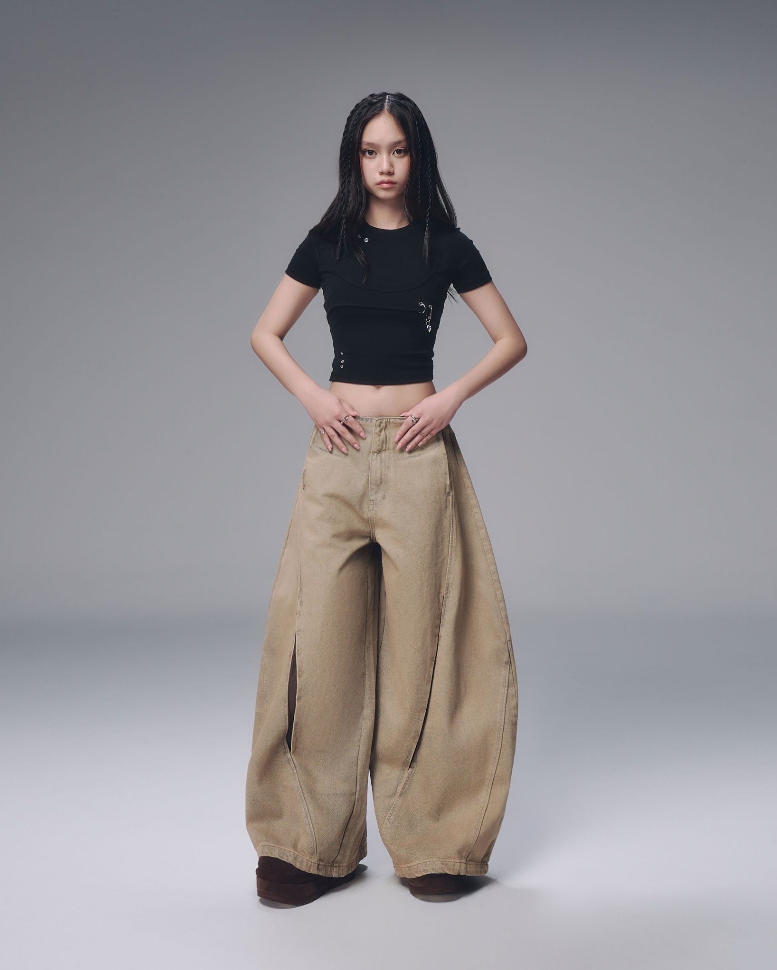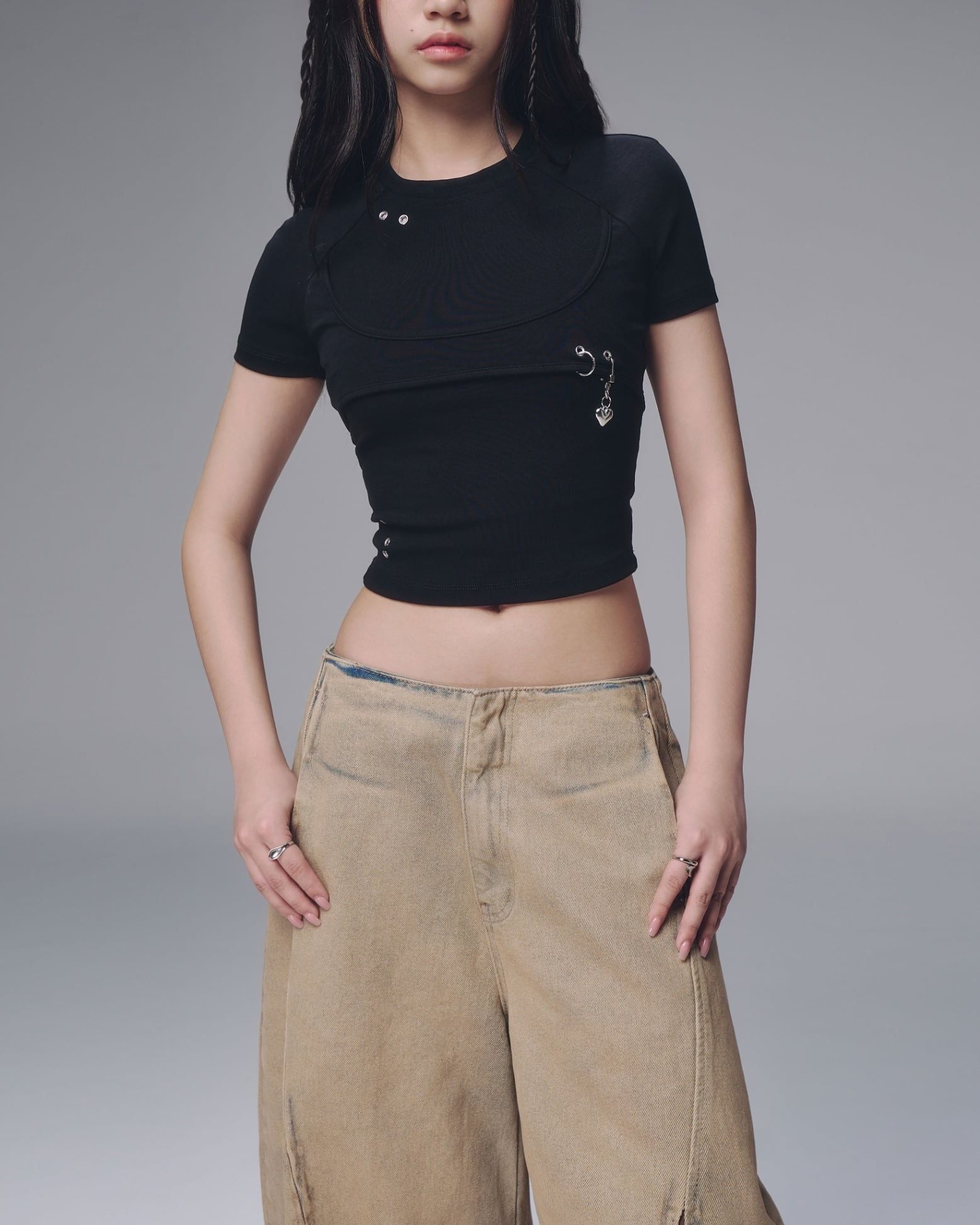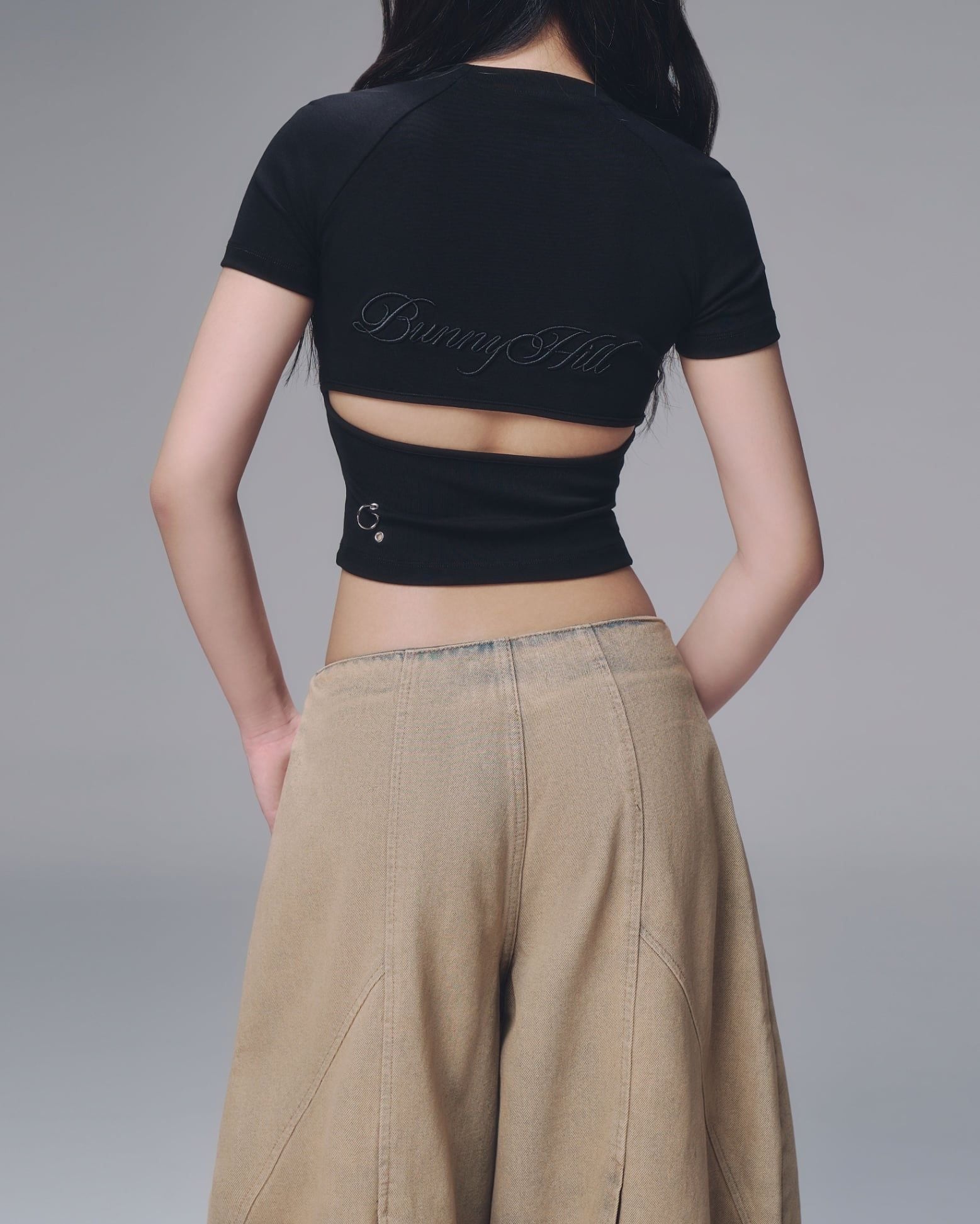 Description: A cut-out back t-shirt with button closure. The shirt comes with a charm attached.