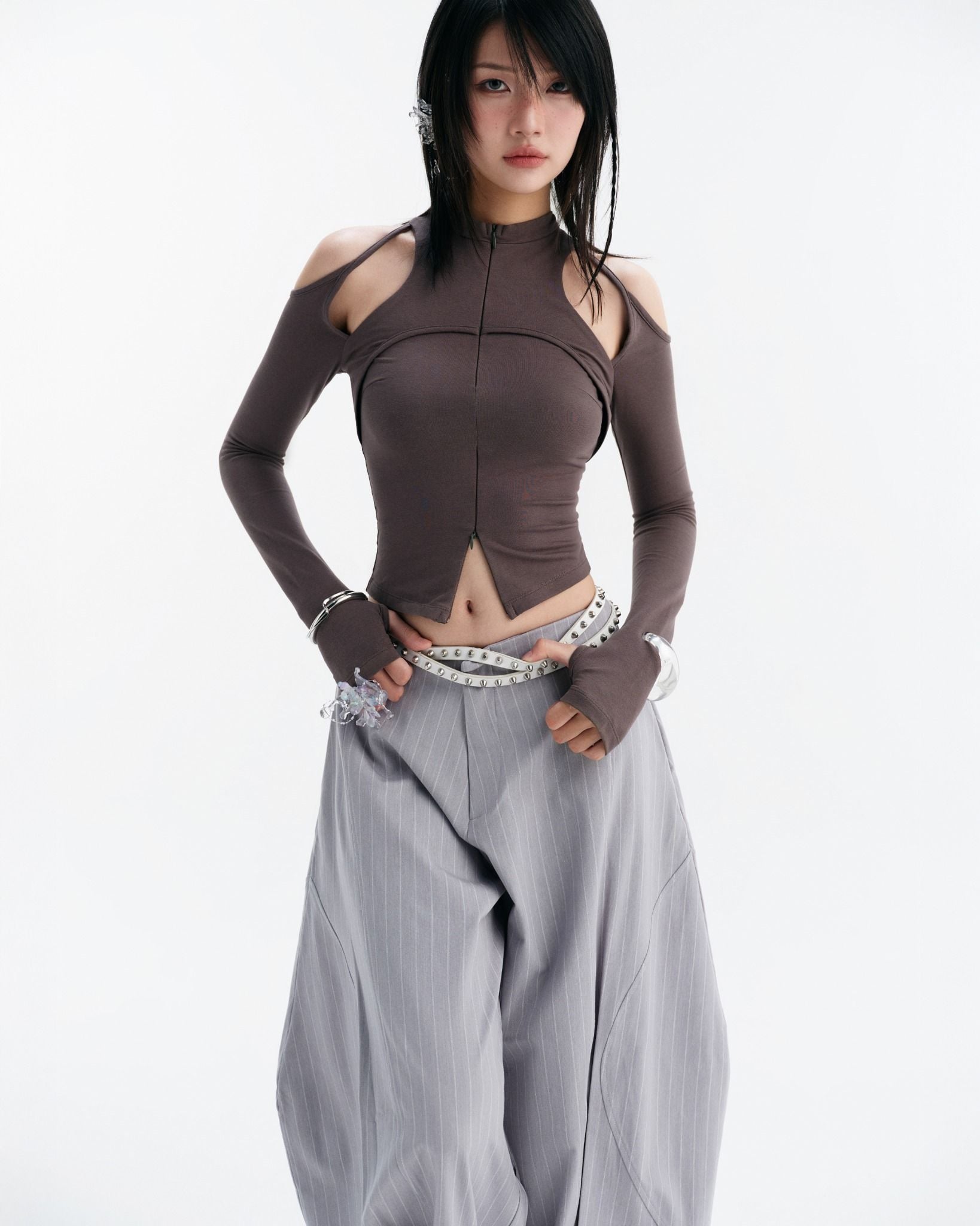 Description: A shoulder cut-out long-sleeve top with finger loops. The front features a two-way zipper. The back has a cut-out design with pearl straps attached.
