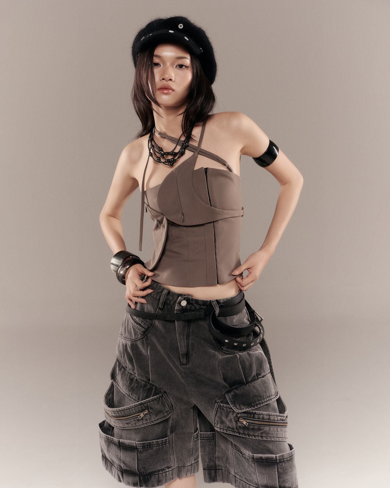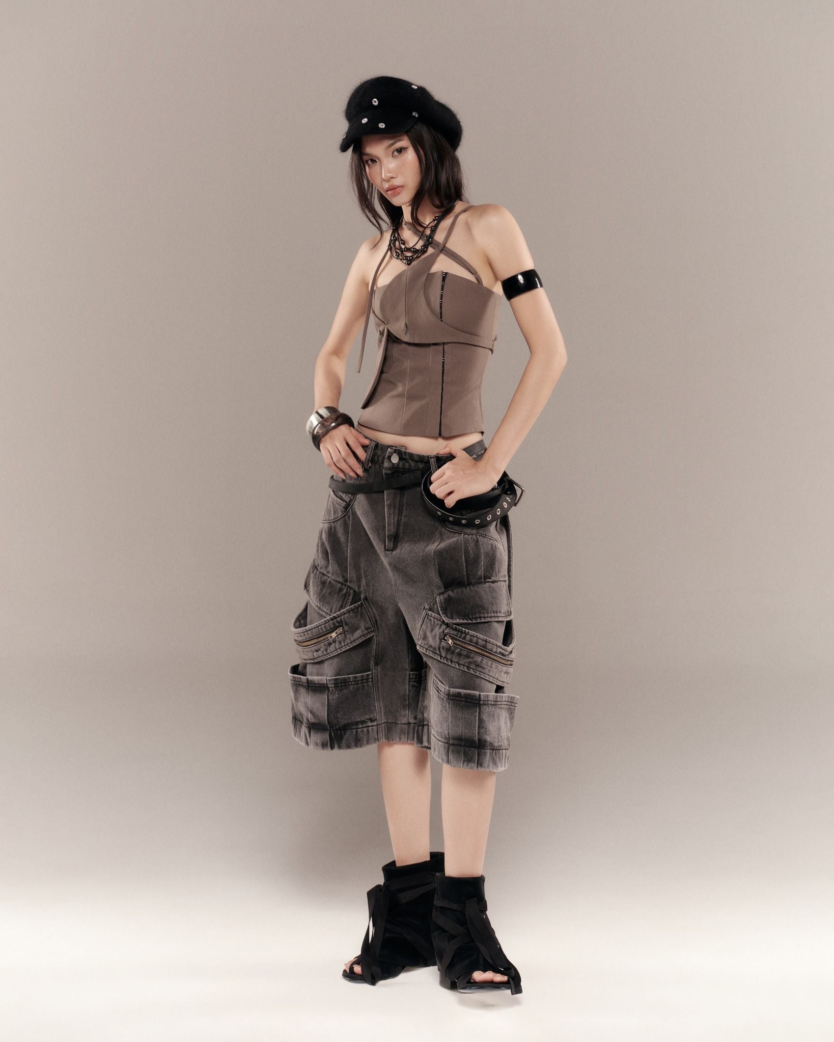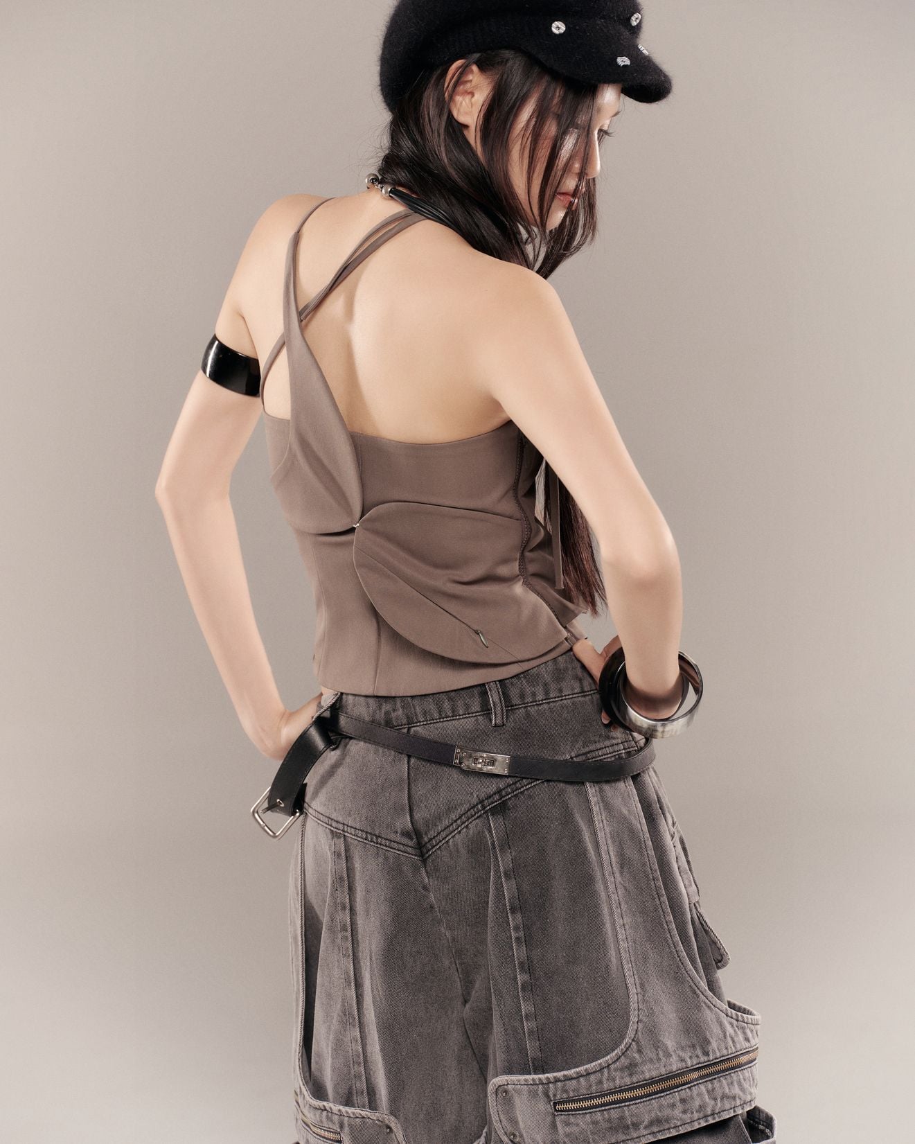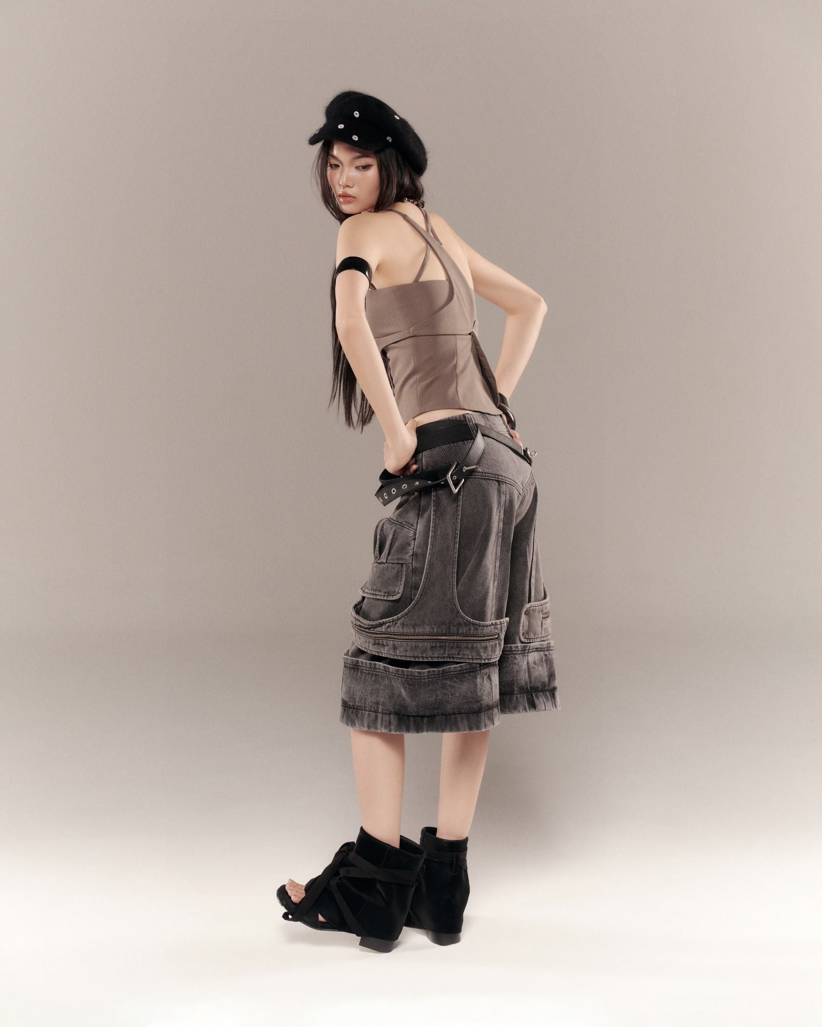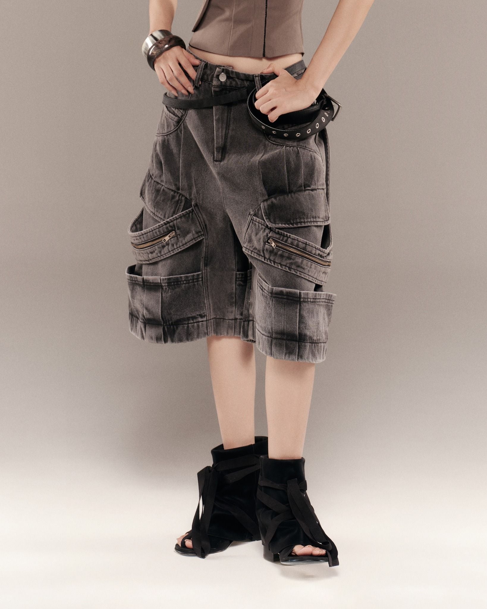Description: Washed denim trousers with pleated details. Features layered panels with zipper accents at the front and back.
