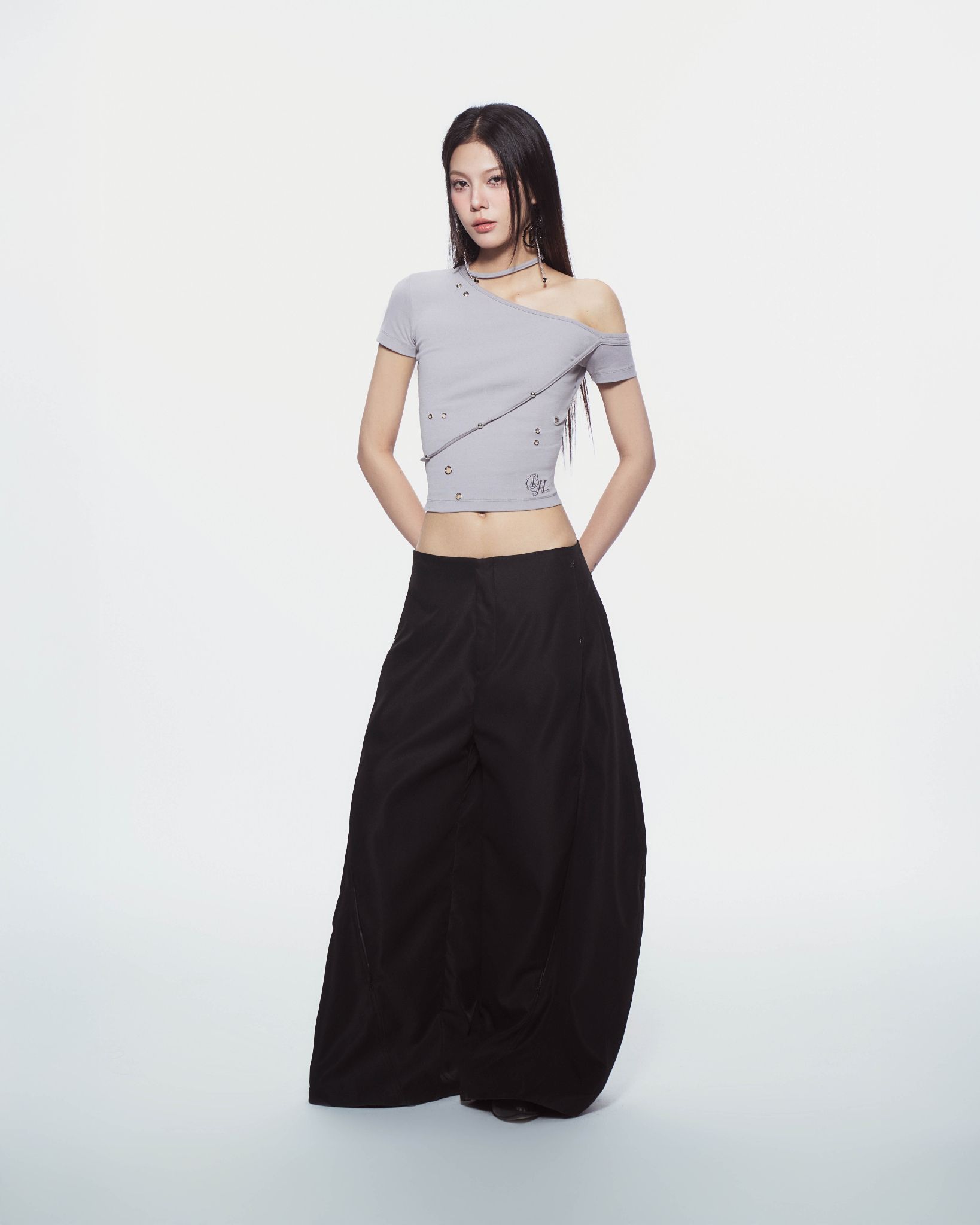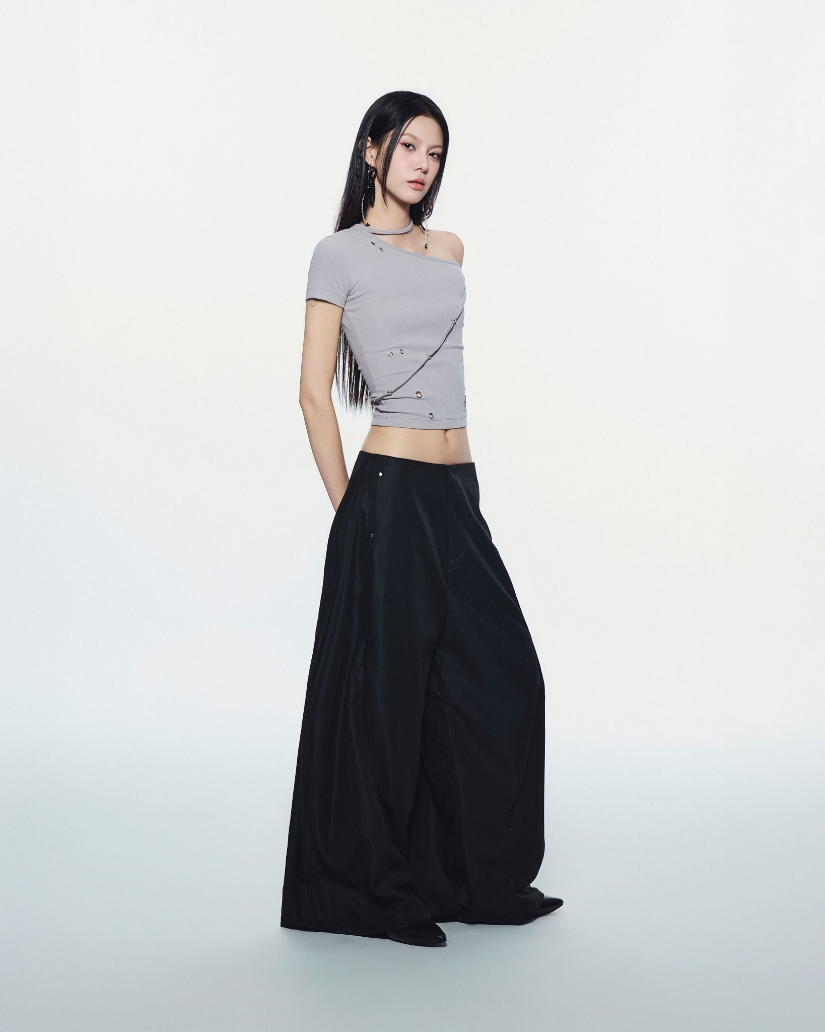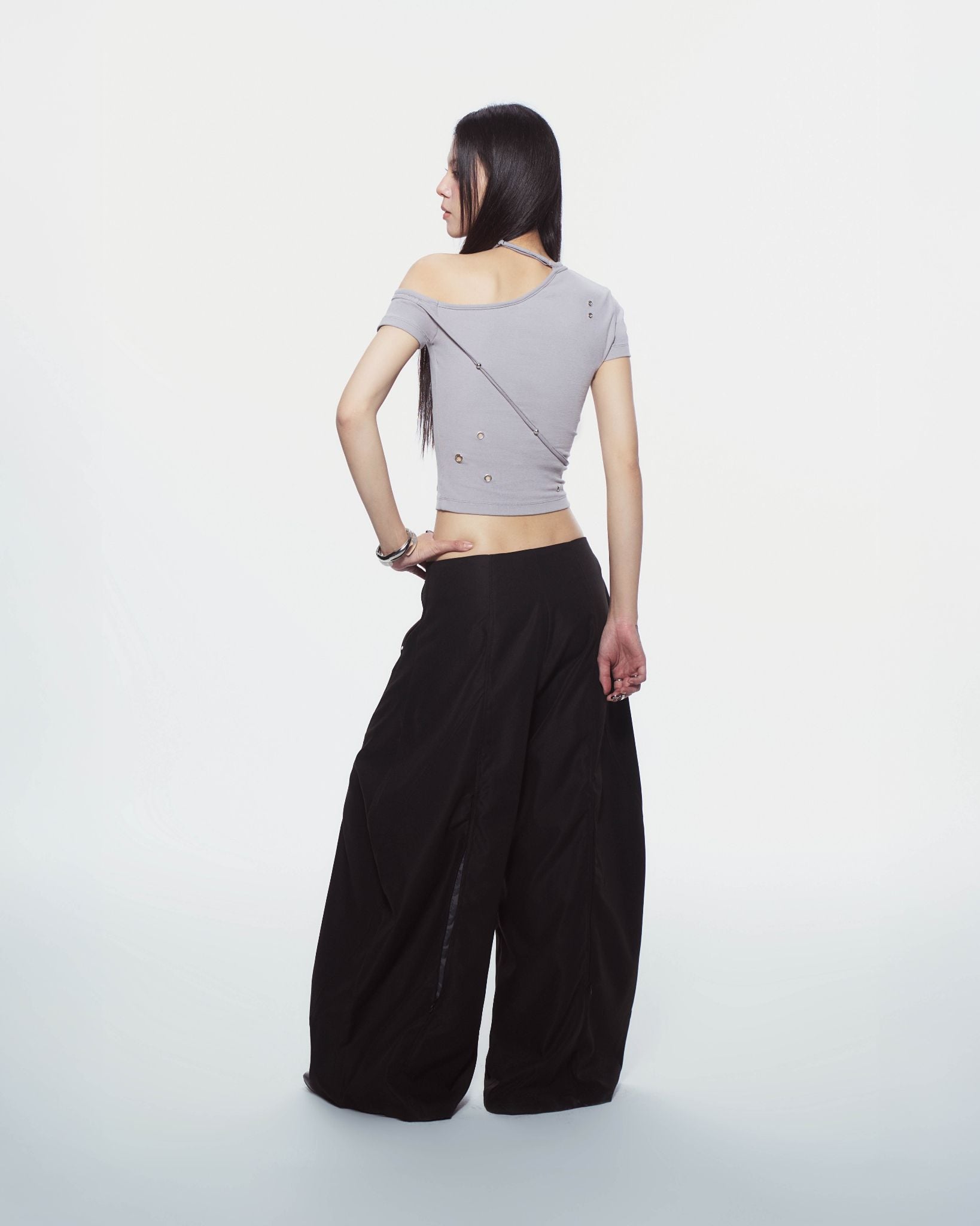 Description: Wide-leg pants with a low waist and a hem that covers the shoes. Features hidden zippers on both the front and back.