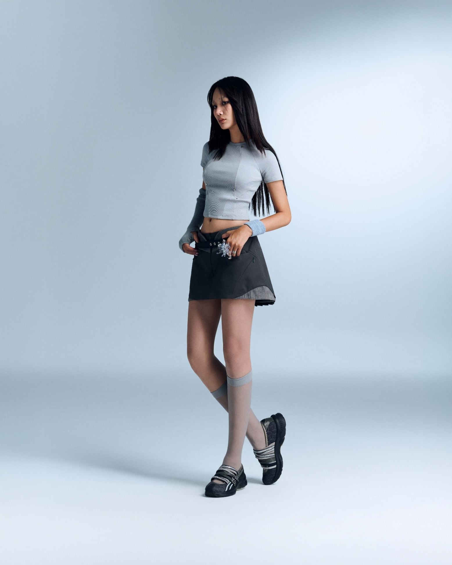 Description: A-line mini skirt with mixed fabrics and back pleats. Lining inside with protective pants.