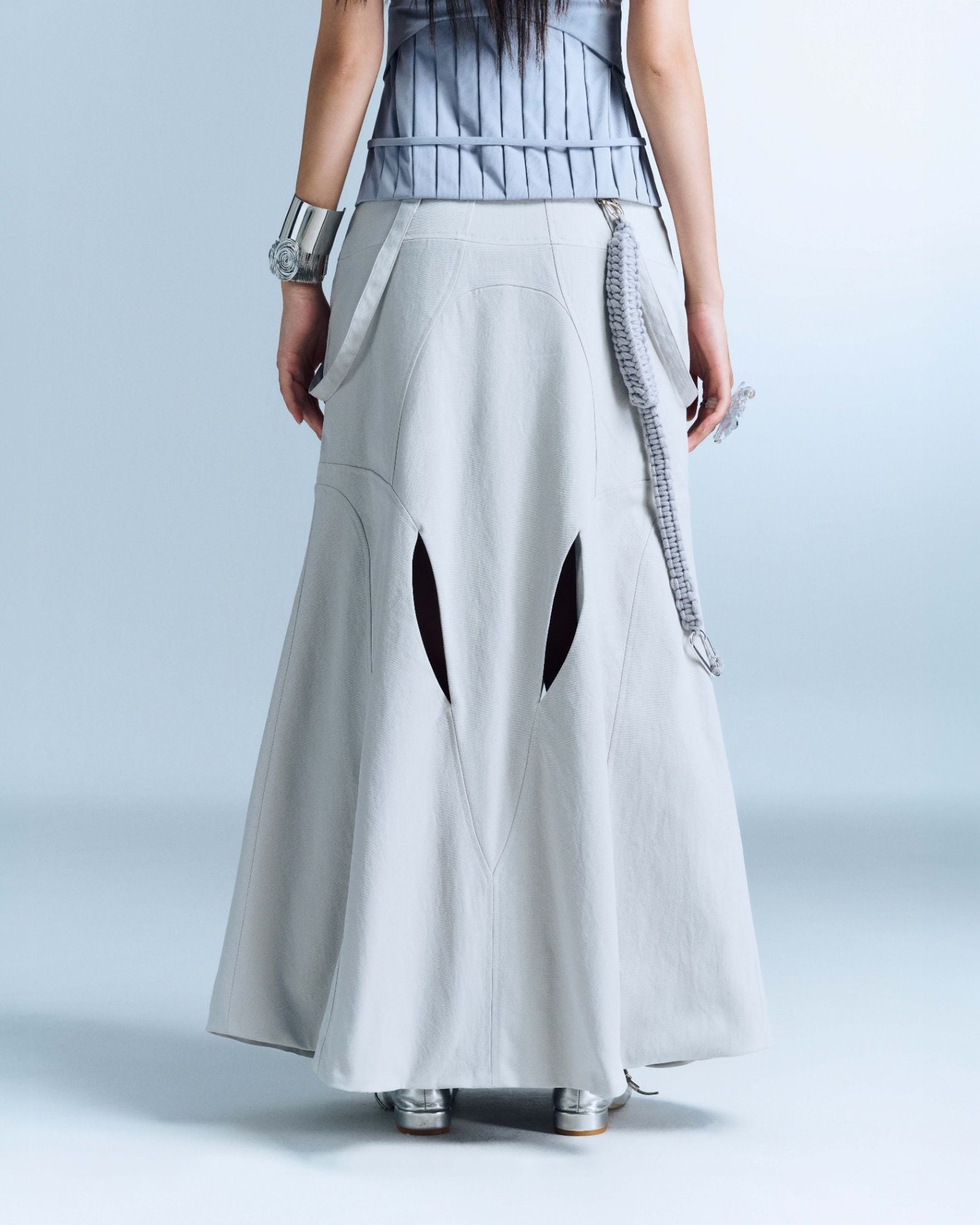 Description: Long A-line skirt with front and back cut-out details.
