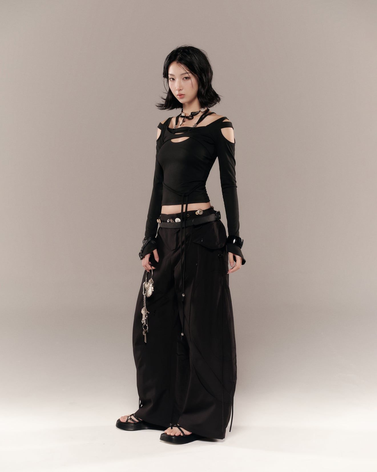 Description: Long-sleeve top with shoulder cut-outs and decorative drawstrings.